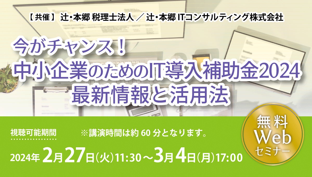 辻・本郷 税理士法人(本社:東京都新宿区、理事長:徳田孝司)は、辻・本郷 ITコンサルティング株式会社(本社:東京都渋谷区、代表取締役:黒仁田健)と共催で「今がチャンス! 中小企業のためのIT導入補助金2024最新情報と活用法」セミナーを開催いたします。IT導入補助金は、中小企業の経営革新や生産性向上に役立つITツールの導入を支援する制度です。そして今回のIT導入補助金2024では、インボイス制度・電子帳簿保存法対応をさらに後押しする内容に変わり、中小企業の方にとって、費用を抑えてITツールを導入する大きなチャンスです。しかし、どんなツールがあるのか、どうやって申請するのか、分からない方も多いのではないでしょうか。本セミナーでは、IT導入補助金2024の概要やメリット、申請方法等をわかりやすく解説し、実際にIT導入補助金を活用した中小企業の事例も紹介いたします。