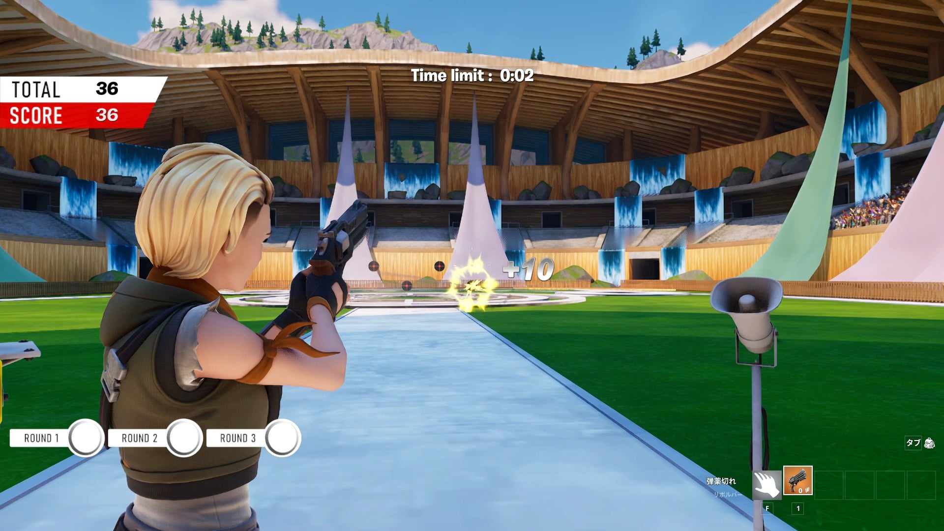 5つの的を制限時間内に狙撃して、3回のチャレンジの合計スコアを競うライフル射撃競技。 早く正確に的へ当てるエイム力が試されます。