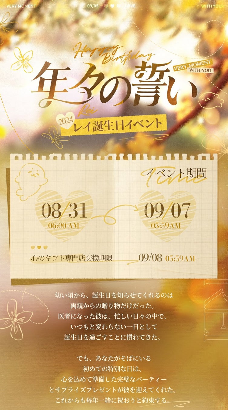 INFOLD PTE. LTD.は、全世界1億DLを突破した『恋とプロデューサー』の世界観を継承した完全新作恋愛シミュレーションゲーム『恋と深空』において、8月31日(土)6時よりレイ誕生日イベント「年々の誓い」を開催することをお知らせいたします。