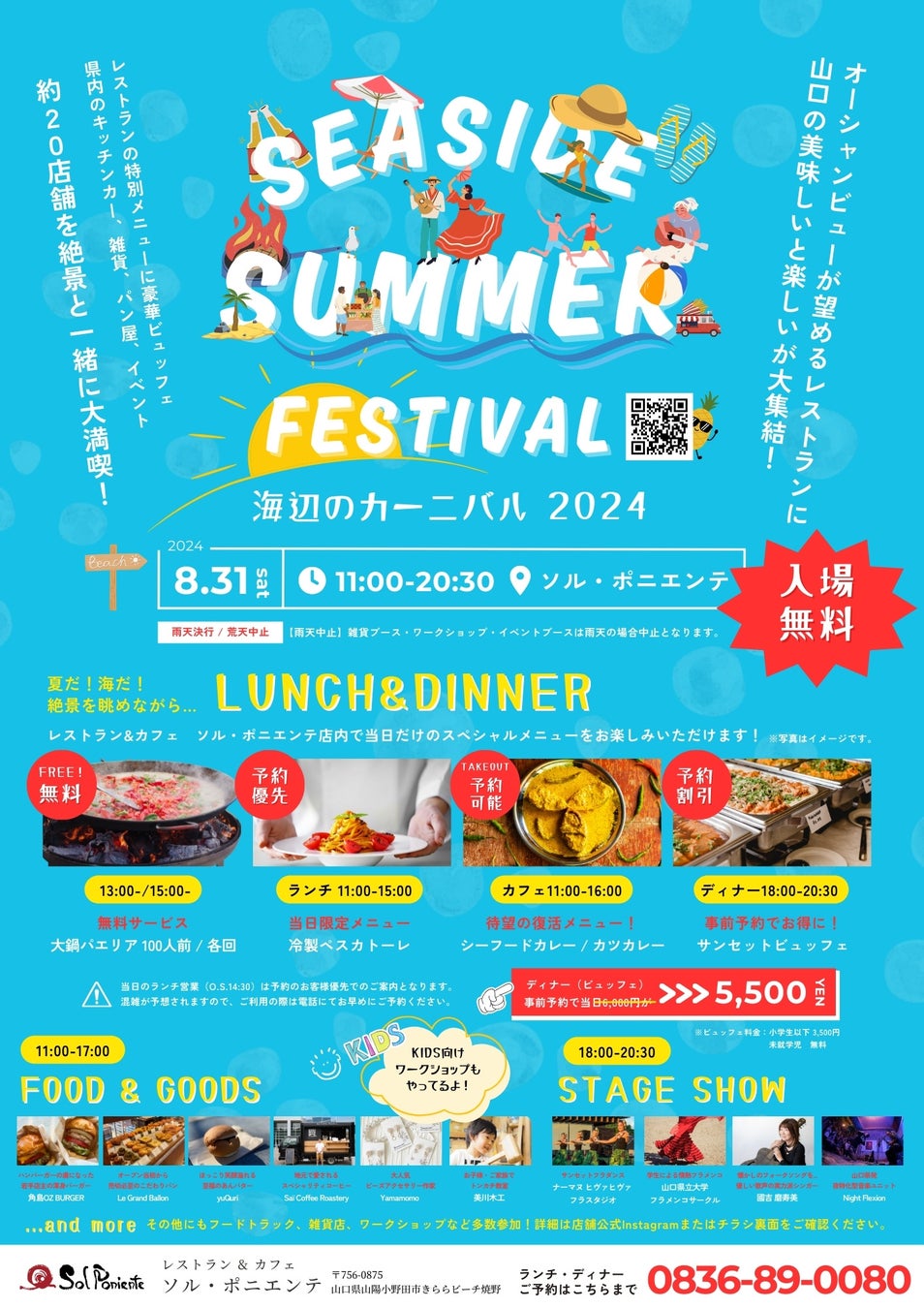 富士商株式会社(本社:山口県山陽小野田市 代表取締役:藤田 敏彦)が運営するレストラン&カフェ「ソル・ポニエンテ」(所在地:山口県山陽小野田市きららビーチ焼野)は、2024年8月31日(土)に過去最大規模のイベント「シーサイドサマーフェスティバル2024」を開催いたします。