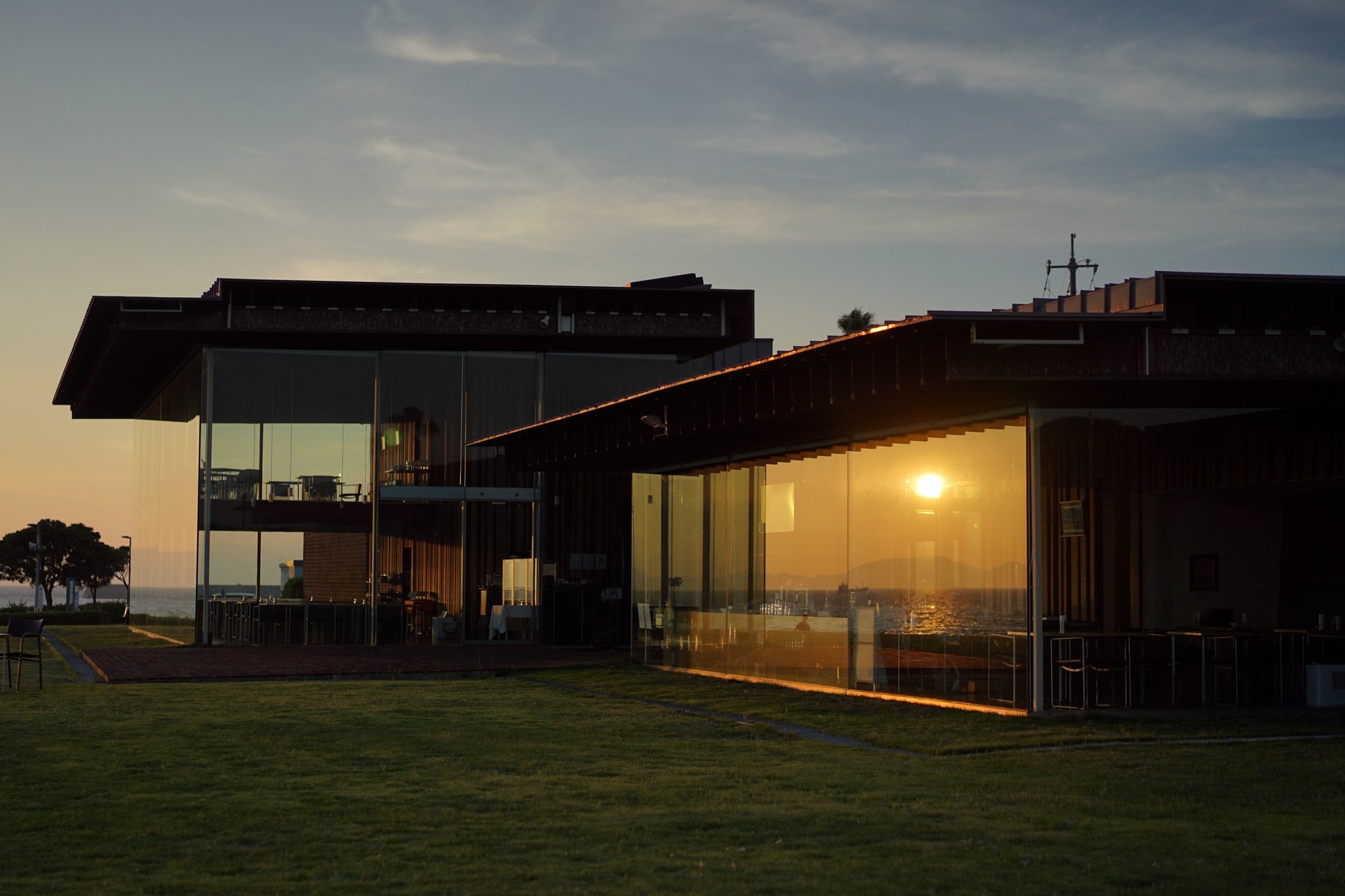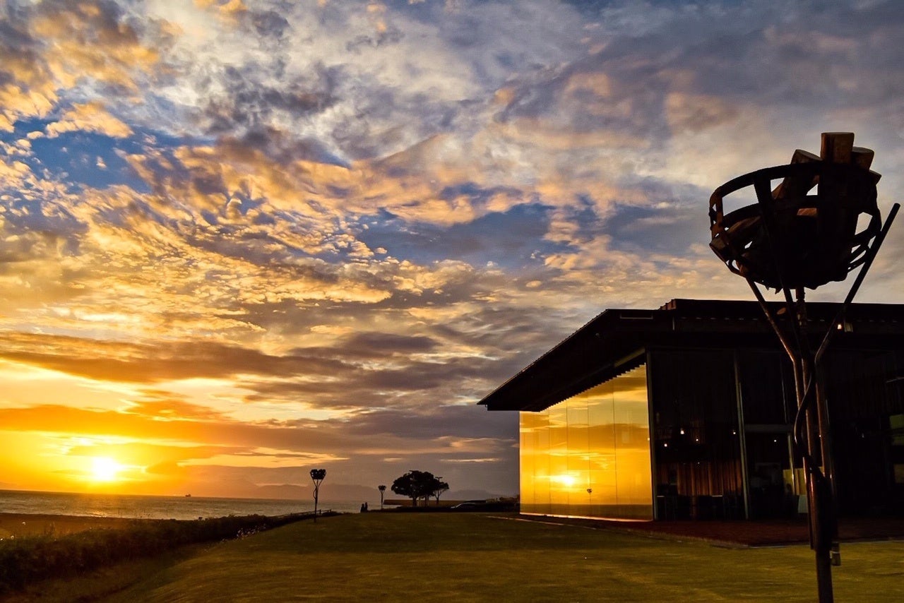 太陽のリフレクションが精巧に 設計された建築のソル・ポニエンテは、世界的建築家 隈研吾 ⽒の2001年に造られた作品、「海∕フィルター」。