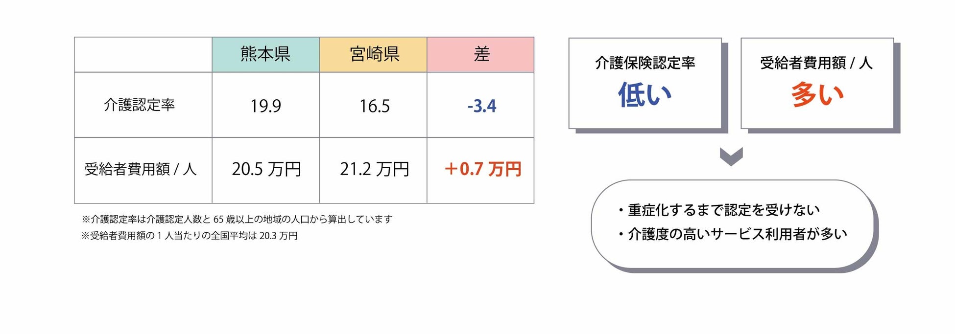 そこで、宮崎県における介護保険の認定状況や通所介護の利用実態を調査し、Let’sリハ!の拠点数が多い熊本県と比較しました。その結果、宮崎県では介護保険の認定率が低い一方で、受給者一人あたりの費用額は高いことから、要介護度の高い方が多くサービスを利用していることが分かりました。これらより、宮崎県では重症化するまで介護保険の認定を受けていない方が多いのではないか、という課題が浮かび上がりました。この課題を解決するために、「要介護度の低い高齢者が早い段階からデイサービスを利用できる環境を整え、重症化を未然に防ぎたい」という強い想いを持ち、Let’sリハ!宮崎北店の開設を決意しました。