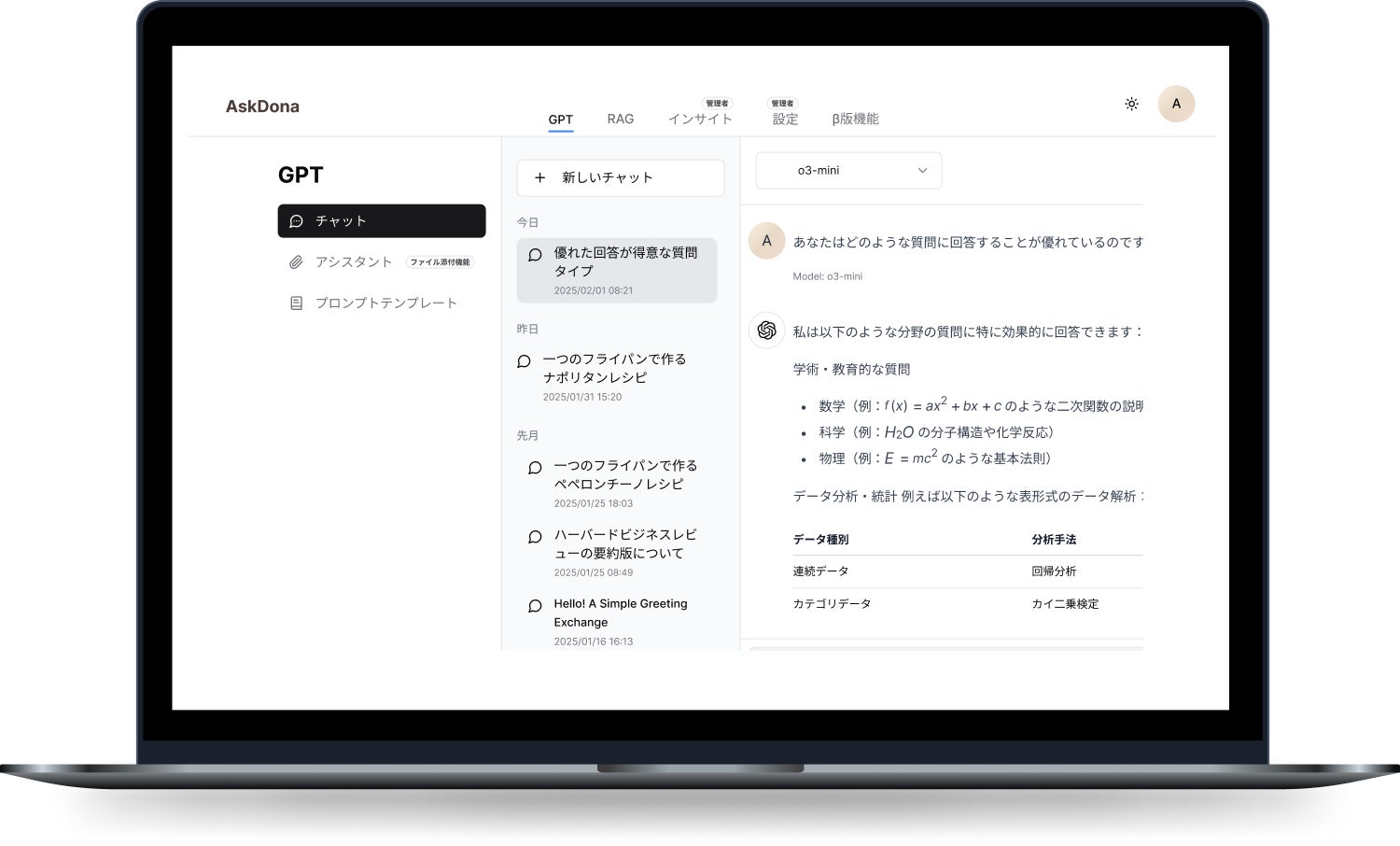 生成AI技術は、ビジネスの様々な領域で革新的な変化をもたらしています。企業が競争力を維持し、成長を続けるためには、常に最新のAI技術を活用することが不可欠です。本日よりAskDona GPTにてo3-miniをご利用いただけます。