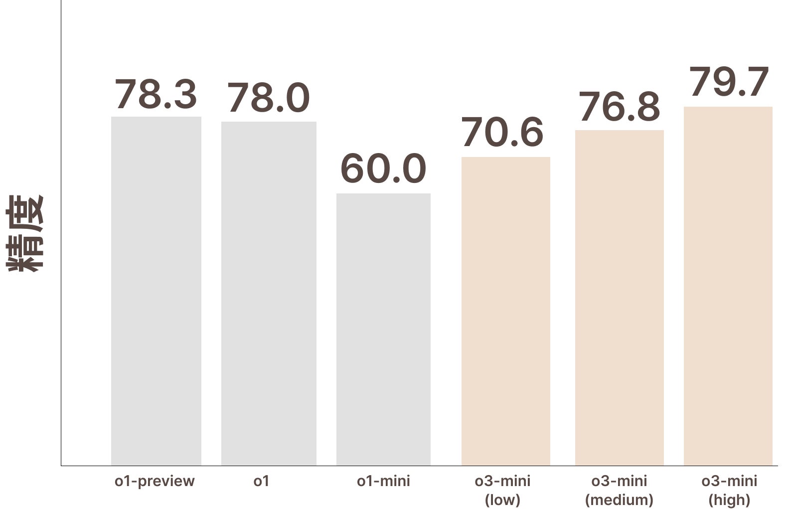 o3-miniの性能を示すひとつを例として、PhDレベルの生物学、化学、物理学の問題において、低い推論労力でOpenAI o3-miniはOpenAI o1-miniを上回るパフォーマンスを発揮し、高い推論労力ではo3-miniはOpenAI o1と同等のパフォーマンスを実現します。