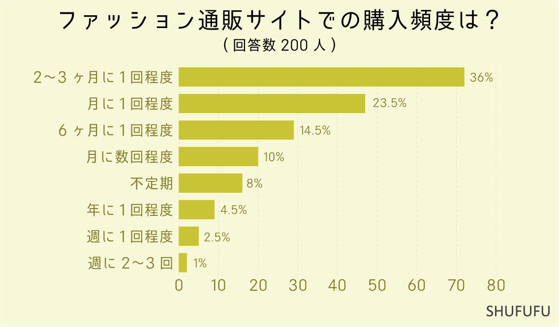 ファッション通販サイトでの購入頻度は?の問いに対して最も多かったのが「2〜3ヶ月に1回程度(36%)」でした。 次いで「月に1回程度(23.5%)」「6ヶ月に1回程度(14.5%)」という結果でした。 週に1回以上利用する人は「3.5%」いました。