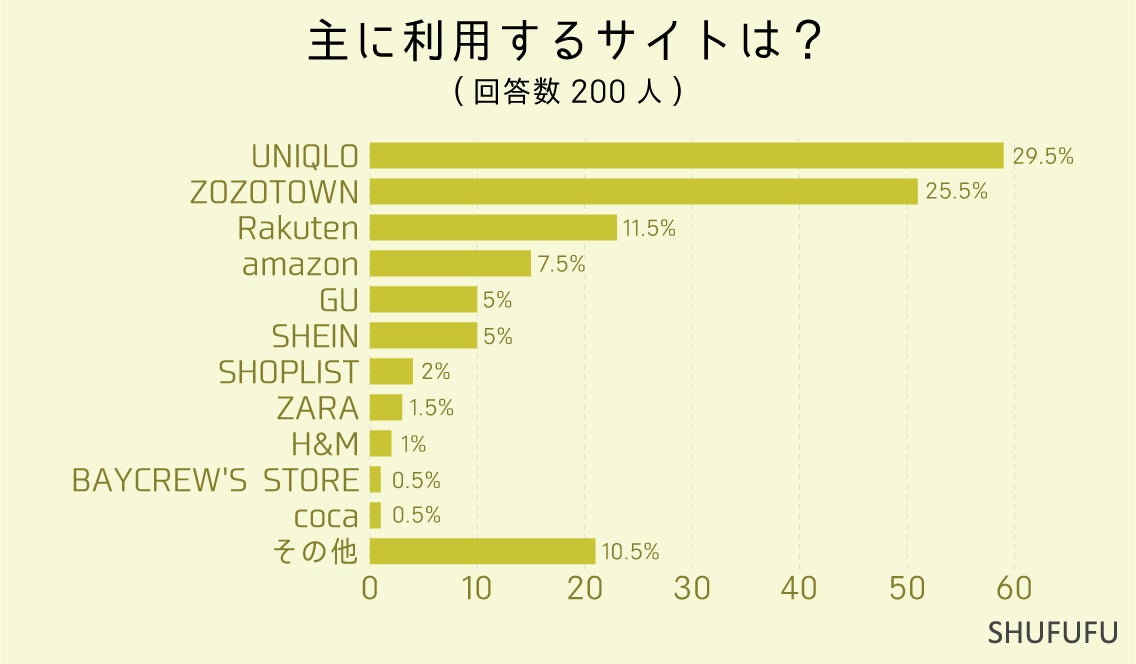 主に利用するサイトに関しては、「UNIQLO」が1位でした。品揃えが豊富でリーズナブル、かつ試着しやすい点が評価されていました。