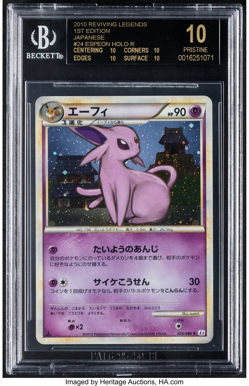 初期のイーブイは特定の進化の石を使うことで3種類のポケモンに進化していましたが、現在では合計8種類もの進化形が存在します。そのうちの1つが、この日本版「よみがえる伝説」カードに登場するエーフィです。この進化は、イーブイがトレーナーとの「なかよし度(なつき度)」を高め、さらにトレーナーのバッグに「たいようのかけら」がある場合に起こるとされています。今回出品されたこの1枚は、BGSよりBlack Label Pristine 10の最高評価を獲得しています。これは、全てのサブグレード(センタリング、角、エッジ、表面の状態)が満点の10点であることを意味し、BGSによってこの評価を受けたカードは世界にわずか4枚しか存在しません。本カードは、今回のオークションにて$2,375(約35万6,000円)で落札されました。