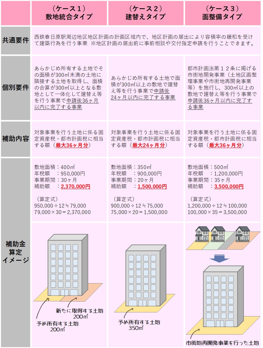 1階に賑わいに資する用途を配置したり滞留空間を設ける等の要件を満たす建築について容積率を最大200%緩和し、あわせて、地区計画を活用した建替えを支援する補助制度を創設しました。補助制度では、建築用地の確保や建築に係る期間の固定資産税・都市計画税相当額の補助金を上限を設けず交付します。容積緩和と補助制度により、春日市の未来を支える都心の発展を官民連携で推進していきます。
