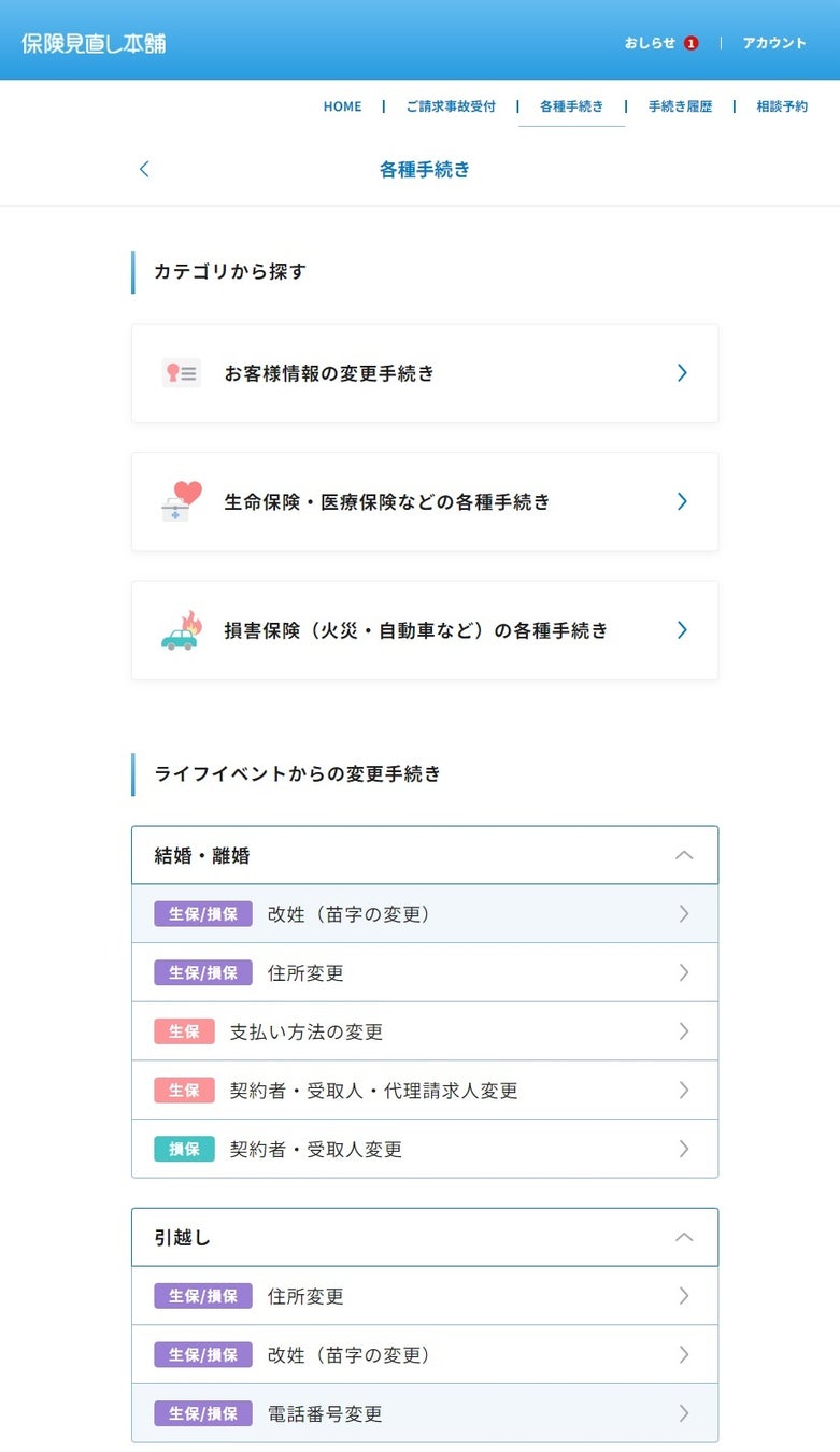 本サービスでは、保険見直し本舗でご契約いただいた*1保険内容が自動表示され、必要な時にいつでも保険の内容をご確認できます。また、住所や支払方法などの各種変更手続き、保険金・給付金請求、事故連絡などの手続きも、カスタマーセンターや店舗の営業時間を気にすることなく、いつでも本サービスから行うことが可能です。さらに、手続きの進捗状況は本サービスで簡単に確認でき、通知機能を利用することで、手続きの進捗やお得なキャンペーン情報を受け取ることができます。
