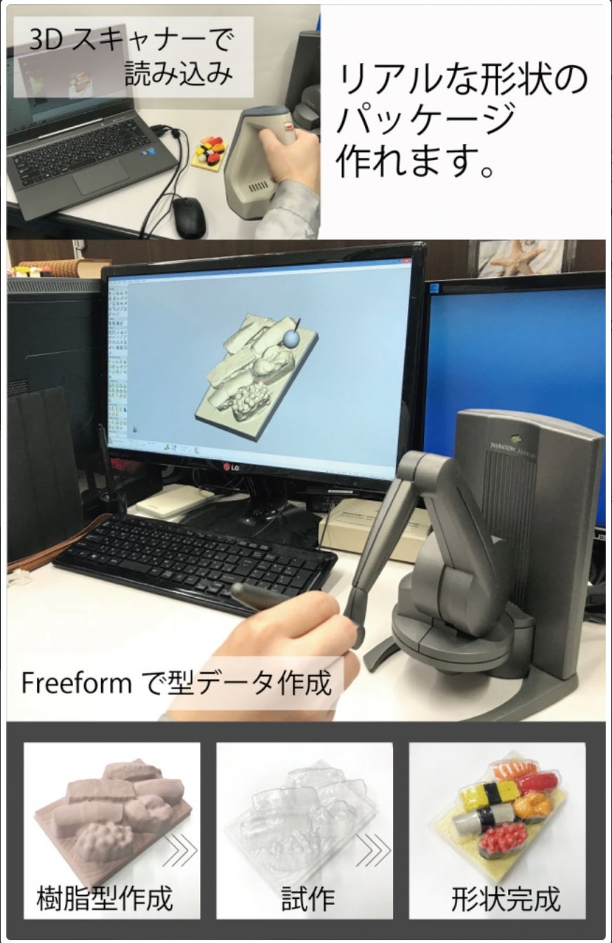 3Dスキャナー・フリーフォームによりデータを作成することで複雑な形状のパッケージ製作を可能としています。個性的であるだけでなく、商品をより魅力的に見せ、手に取りたくなる効果があります。