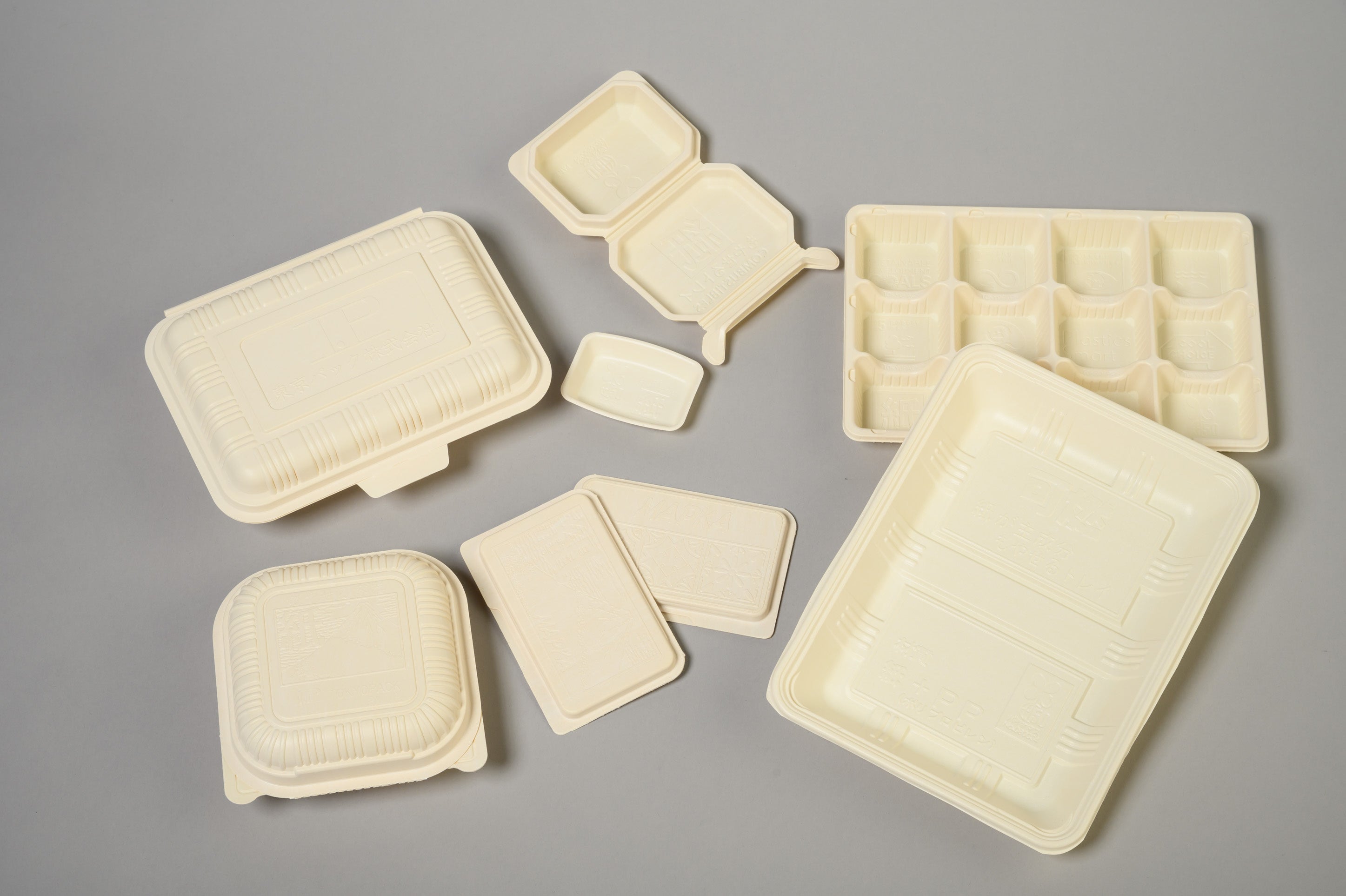 トウモロコシ澱粉とポリオレフィンを複合させた「レジームST」、卵の殻を混ぜてプラスチックの使用料を減らした「「卵殻入りのバイオマスプラスチック」などがあります。