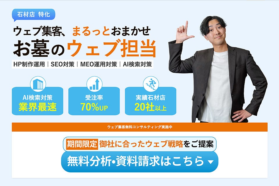 お墓のウェブ担当では、内部対策(Hタグやパンくずリストなどの構造化)から外部対策(被リンク獲得・口コミ活用)まで、記事内で指摘される施策をワンストップで対応可能です。
