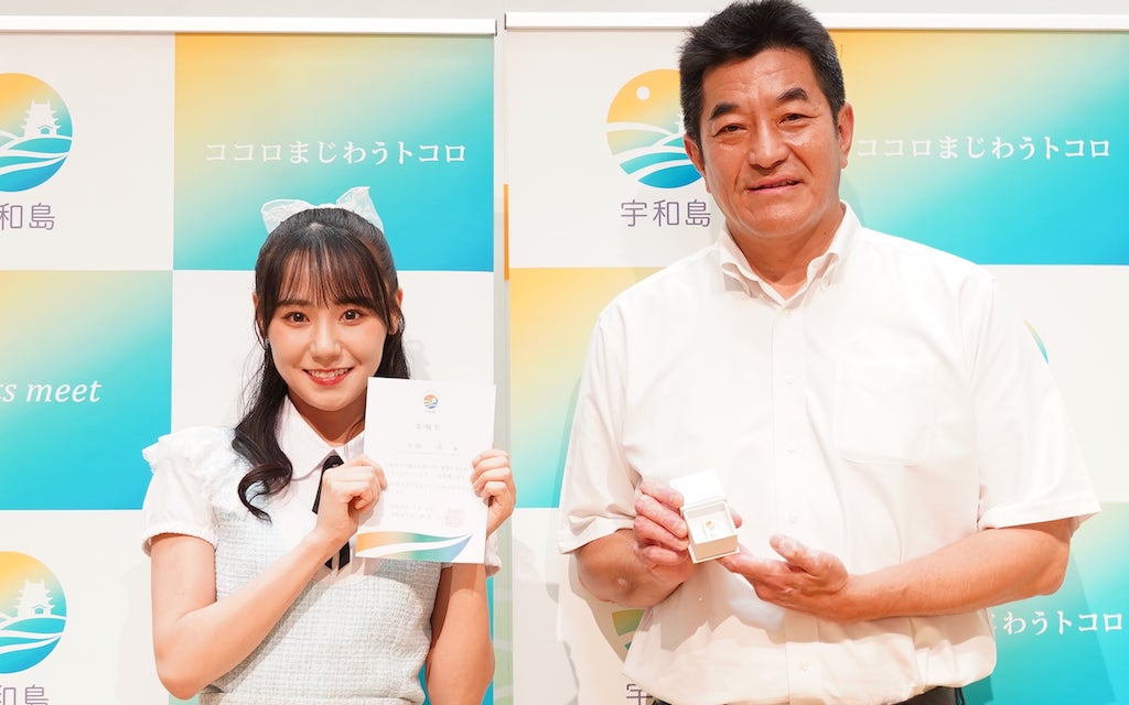 イベントでは、宇和島市の認知度やブランドイメージ向上を図るとともに、シティセールスの推進に資するため、観光や芸術文化、スポーツ、産業振興などの分野において、宇和島市に関心や愛着を持ち、国内外に魅力を幅広く発信することができる方に委嘱される「うわじまアンバサダー」の委嘱式が行われ、宇和島市出身の兵頭 葵が「うわじまアンバサダー」に就任し、宇和島市長 岡原文彰氏より委任状が交付されました。宇和島市長岡原文彰氏が登壇すると足を止めた買い物客からも大きな拍手があがった。岡原市長は「宇和島市に来ていただいて兵頭 葵さんが生まれ育った空気を感じていただければ嬉しいです。」とコメント。兵頭 葵は「このような名誉ある“うわじまアンバサダー”に就任させていただいたこと本当に光栄に思います。ファンの皆さんの支えがあってこそだと思うのでこれからもファンの皆さんの力を借りつつ私らしく宇和島の魅力をたくさん発信していきたいとと思っています。」と意欲を語り感謝した。