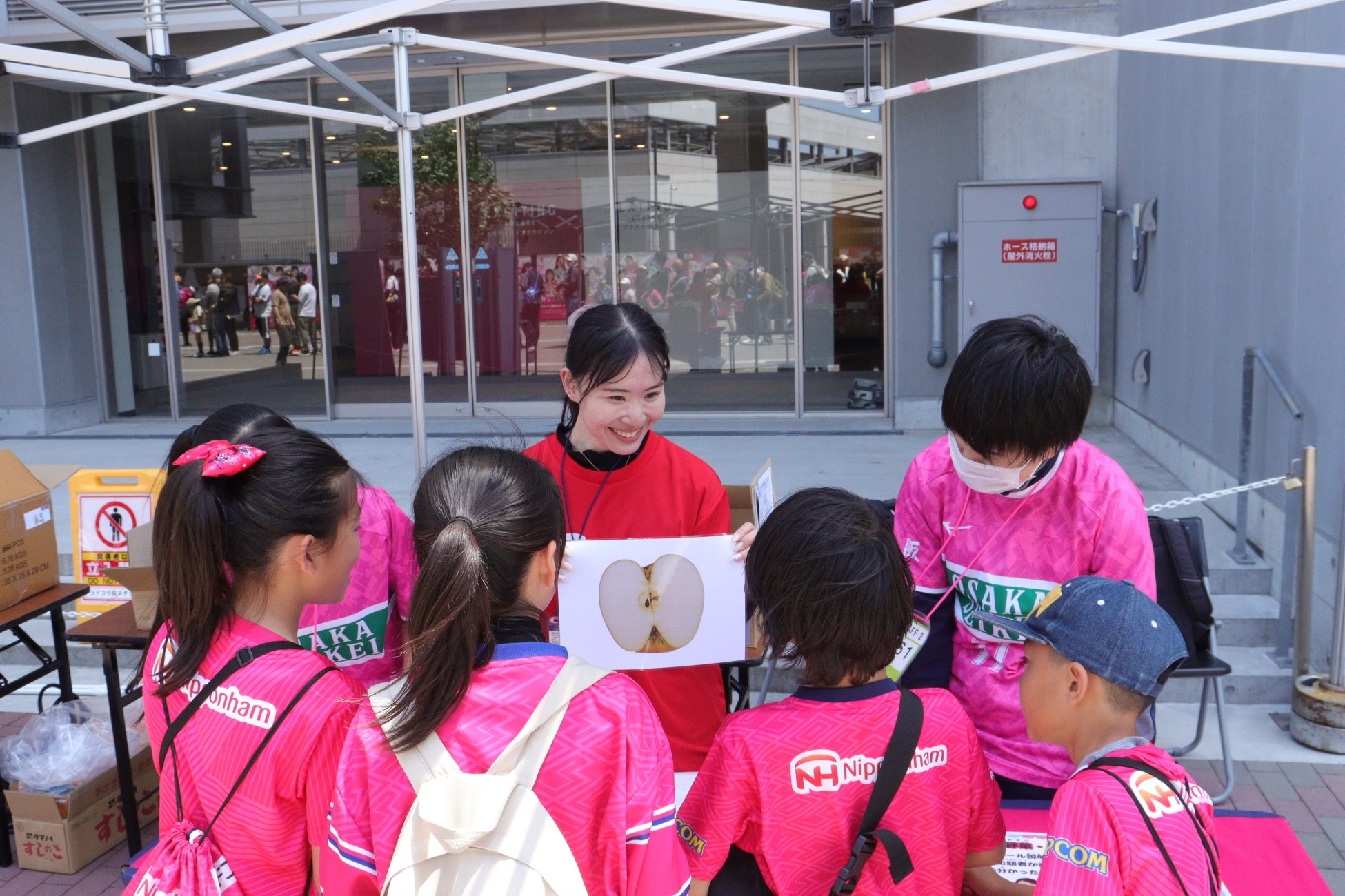 当日は、セレッソ大阪スポーツクラブ出向中の管理栄養士が食育ブースを設営。野菜や果物の断面クイズや漢字クイズを通じて楽しみながら学びを深め、野菜や果物に興味を持っていただくきっかけとなりました。子どもたちの食への関心を高め、健やかに成長してもらうことを目指しています。