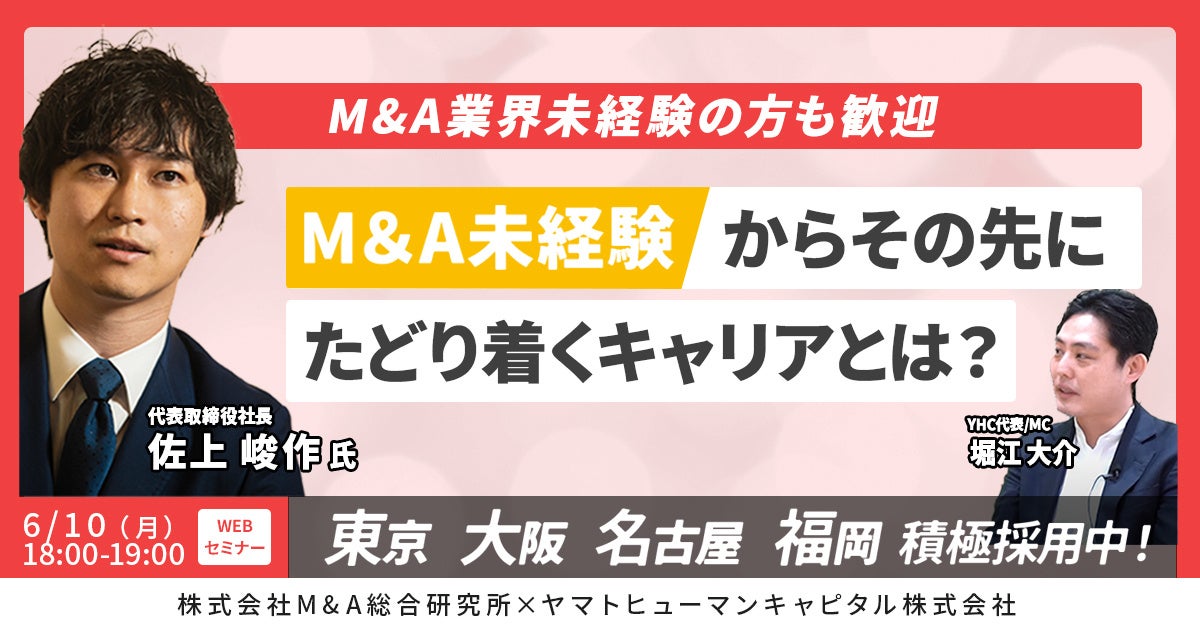 ヤマトヒューマンキャピタル株式会社(本社:東京都千代田区、代表取締役:堀江 大介)は、2024年6月10日(月)18:00よりオンラインにて、株式会社M&A総合研究所代表取締役社長佐上峻作氏にご登壇いただくウェビナー『M&A仲介のネクストキャリアの可能性を全て話します!』を開催いたします。