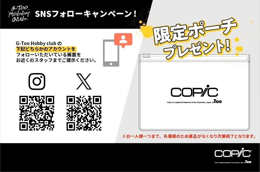 コピックのホビークラブ「G-Too Hobby Club」のSNSアカウント(InstagramもしくはX)をフォローいただいた方に、パーツ入れ等に最適なホビーイベント限定COPICポーチをプレゼントします。
