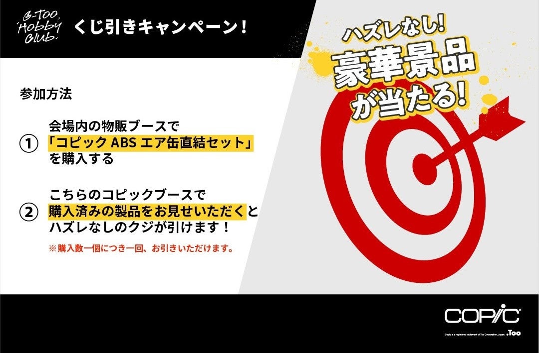 会場内の物販ブースでキャンペーン対象商品を購入し、コピックブースで購入商品をお見せいただいた方にくじを引いていただけます。くじはハズレなし、豪華景品が当たるチャンスです!ぜひご参加ください。