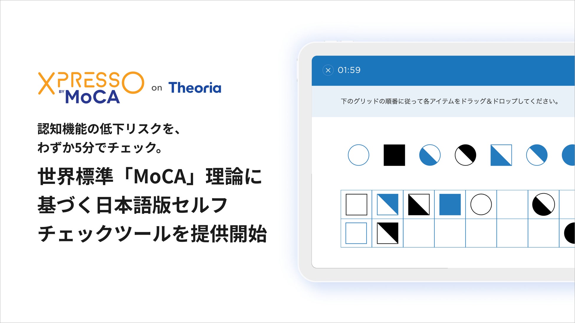 エーザイグループで、認知症のリスク低減から発症後のケアまで、一人ひとりに最適なソリューションを届ける「認知症プラットフォーム」を提供するテオリア・テクノロジーズ株式会社(本社:東京都千代田区、代表取締役CEO:坂田 耕平、以下 テオリア)は、世界100カ国以上で採用されている認知機能検査「MoCA(モントリオール認知機能評価)」の理論に基づいた、一般向けデジタル認知機能チェックツール「XpressO(以下、エクスプレッソ)」日本語版の提供を開始しました。