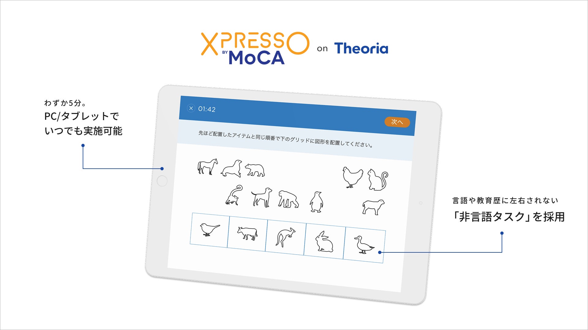 言葉の知識や聴力の影響を受けにくい図形や配置を用いた課題により、どなたでも直感的に、かつ純粋な認知パフォーマンスをチェック可能です。