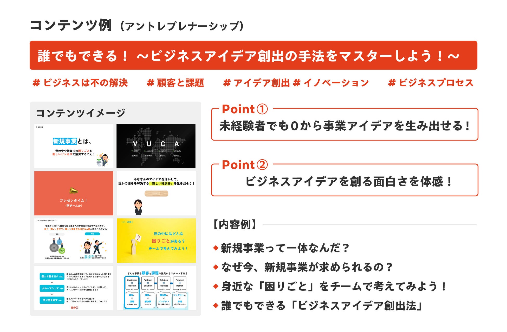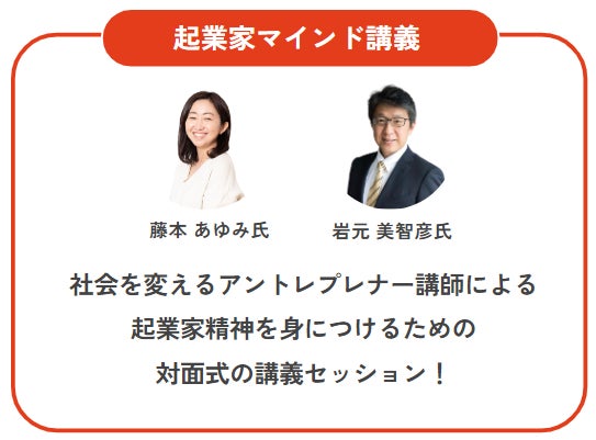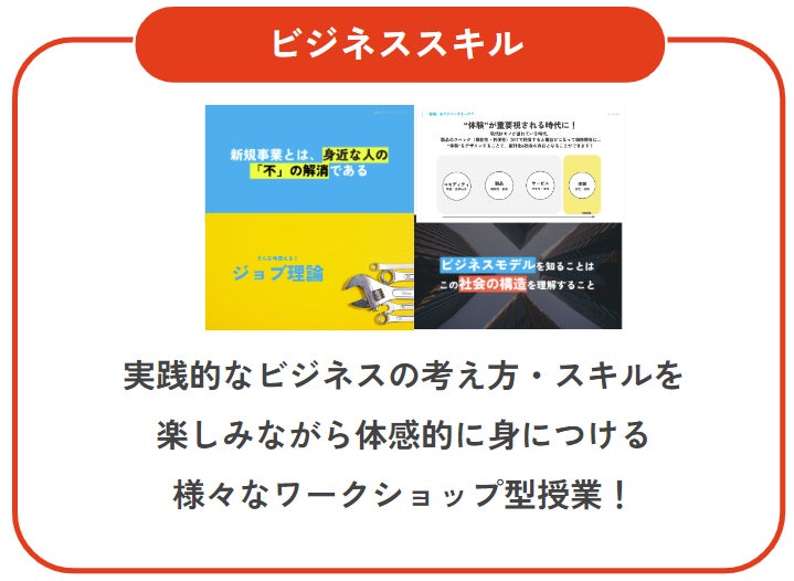 また、アントレプレナーシップのプログラムにおいては、「起業家マインド講義」と称した対話型の講義セッション、「ビジネススキル」と称したビジネスの考え方を身につけるワークショップ型授業、事業アイデア支援等を予定しています。