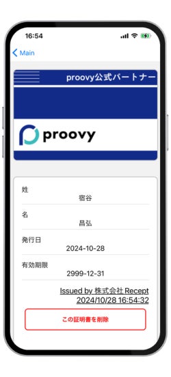 本実証実験として、最終的に Recept は、eシールが付与された 「proovy 公式パートナー証明書VC」 の発行を行い、同 VC は、Recept が提供するユーザー用デジタルウォレットに格納されました。