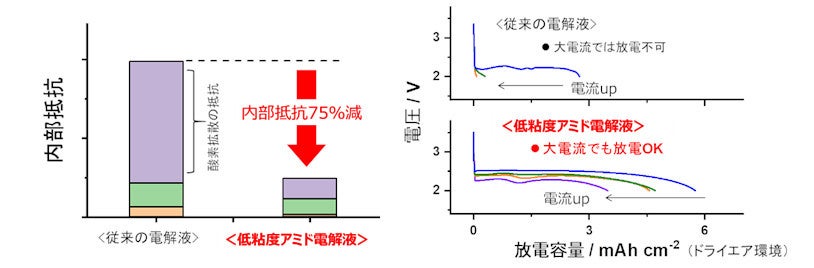 次に研究チームは電池反応を加速する電解液の設計に取り組みました。電解液はリチウムイオンと酸素をカーボン電極の反応面へ運ぶ重要な役割を果たします。出力電流が大きくなるほど、リチウムイオンと酸素の迅速な輸送が求められます。リチウム空気電池の高い電池電圧と酸化ストレスに耐えうるアミド溶媒(7)の電解液を用い、リチウム空気電池セルの内部抵抗を分析したところ、電解液中の酸素の拡散輸送にかかる抵抗が大きな抵抗成分となっていることを突き止めました。そこで酸素の拡散性を高めるべく、粘度の低いアミド溶媒をベースに電解液を設計することにより、セルの内部抵抗を抑え出力電流を大幅に増大させることに成功しました(図2)。