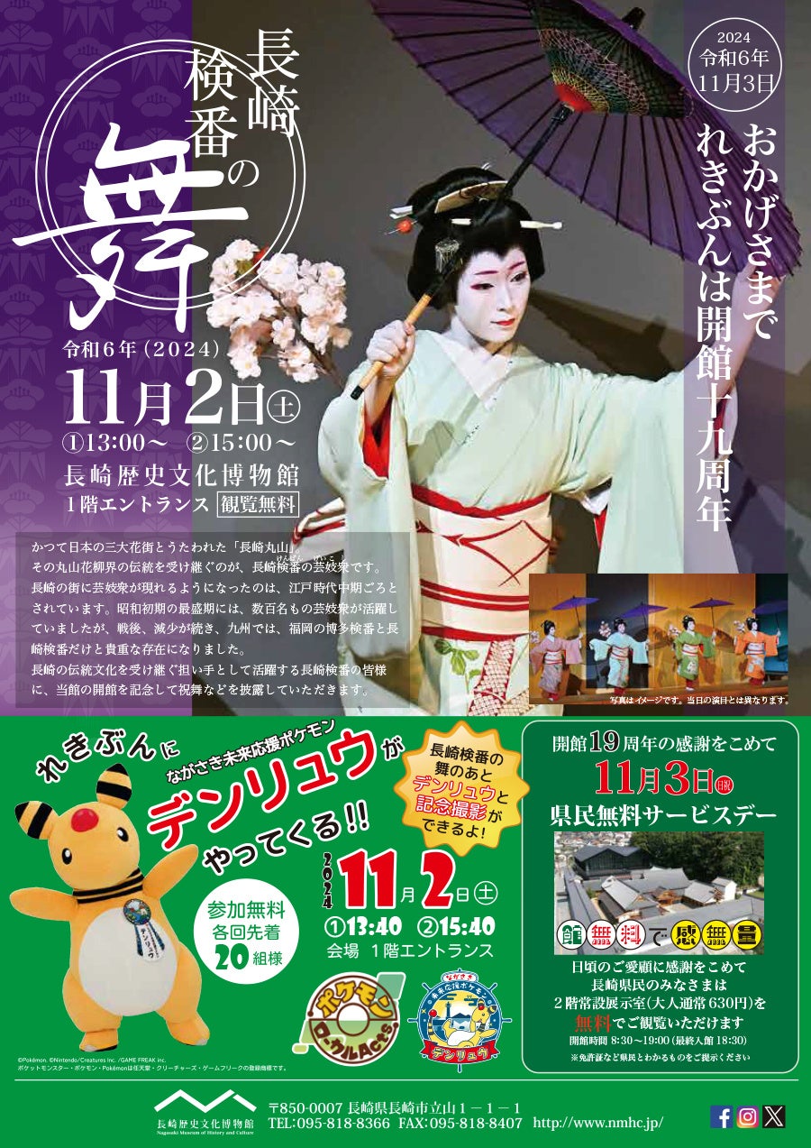 そこで、日頃のご愛顧に感謝をこめて、長崎検番による祝舞や、長崎県民常設展観覧無料サービスを実施いたします。ぜひご取材・情報掲載のほど宜しくお願いいたします。