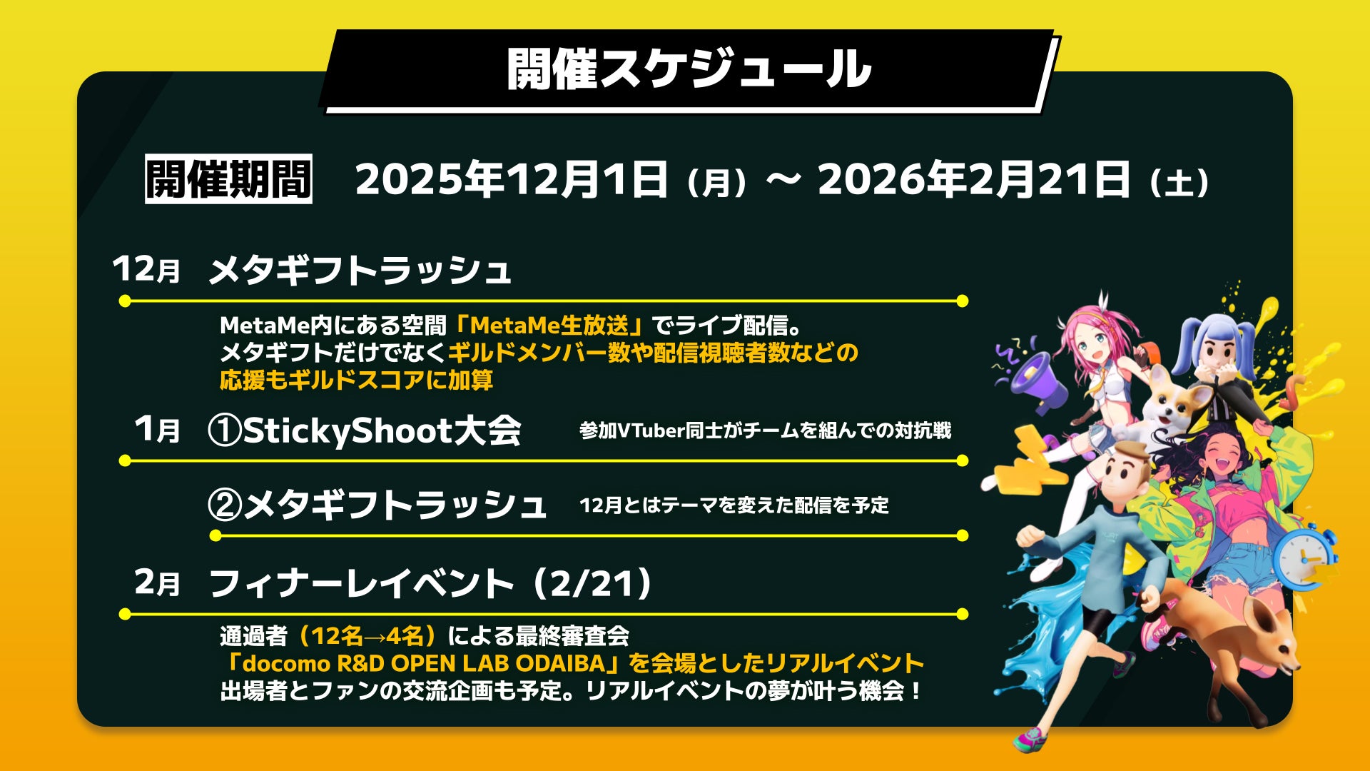 本イベントは、MetaMeギルド*2活動を通して生まれる双方向のコミュニケーションにより、ファンとのつながりを深め、そして広げる活動を応援します。数々のドラマを生んだVol.1を経て、さらにパワーアップした本グランプリの開催に伴い、2025年10月1日(水)から10月19日(日)までの期間、グランプリ本戦への出場権をかけた参加者オーディションを開催いたします。