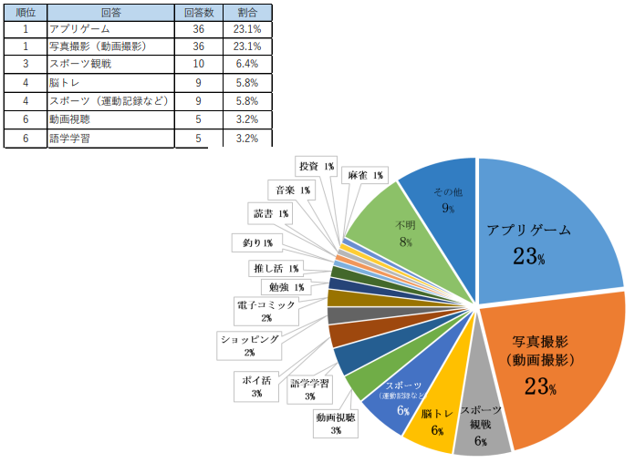 「アプリゲーム(約23.1%)」や「写真撮影(約23.1%)」に利用している人が最も多く、次いで「スポーツ観戦(約6.4%)」、「脳トレ(約5.8%)」に利用している人が多く見られました。