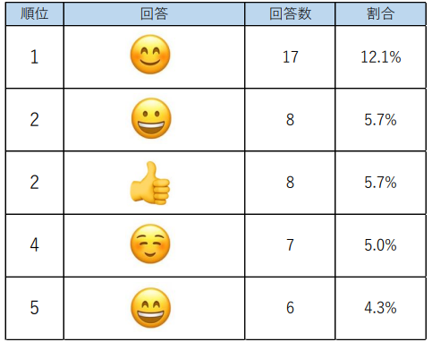 シニアがよく使用する絵文字ランキング1位は以下の通りで、以降ランキング上位は大半が顔の表情の絵文字であることが明らかになりました。シニアのスマホ上でのコミュニケーションでは、笑顔など表情を添えてコミュニケーションを図っていることが考えられます。また、調査回答の中では「絵文字は古くさいと教わり使わない」という回答も見られ、孫や若い世代からスマホ上でのコミュニケーションの取り方を教わっているシニアもいることが読み取れます。