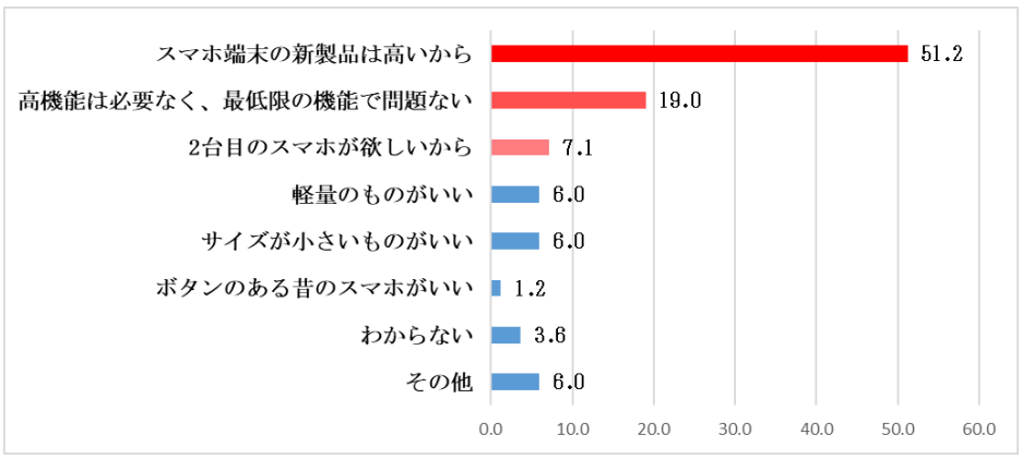 理由は「新商品は高価格だから(約51.2%)」が約半数と最も多く、次いで「高機能は必要なく、最低限の機能で問題ないから(約19.0%)」、「2台目のスマホが欲しいから(約7.1%)」という回答でした。ほとんどが価格面や機能面の理由で中古スマホを検討しているという結果となりましたが、一方で「2台目スマホ」を検討するほど、スマホをフル活用しているシニアがいることも明らかになりました。