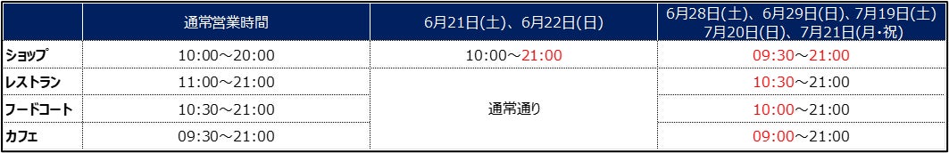 グランドオープンから7月中、一部日程で営業時間を延長いたします。気温が下がる夕方以降にもゆっくりとお買物をお楽しみいただける環境を整え、より多くのお客様に快適なひとときをご提供いたします。ぜひこの機会に、時間を気にせずゆったりとしたショッピングをお楽しみください。