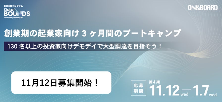 ON&BOARD株式会社(所在地:東京都港区虎ノ門、代表取締役:下平将人、中山航介 以下「当社」)は、11月12日(水)より、創業支援プログラム・第4期「Out of BOUNDS」の参加者の募集を開始することをお知らせいたします。