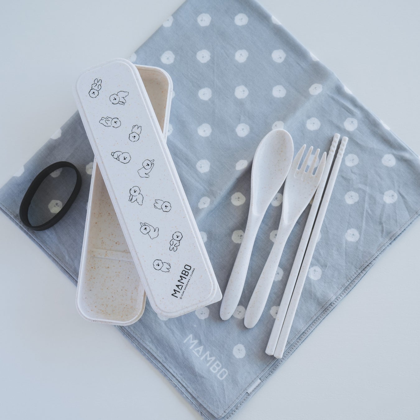 竹繊維を使用した、バンブーファイバータイプのカトラリーセット。 箸、スプーン、フォーク、ケース、シリコンバンドのセットです。(※下に敷いたハンカチはLUCKY BAG に含まれておりません)