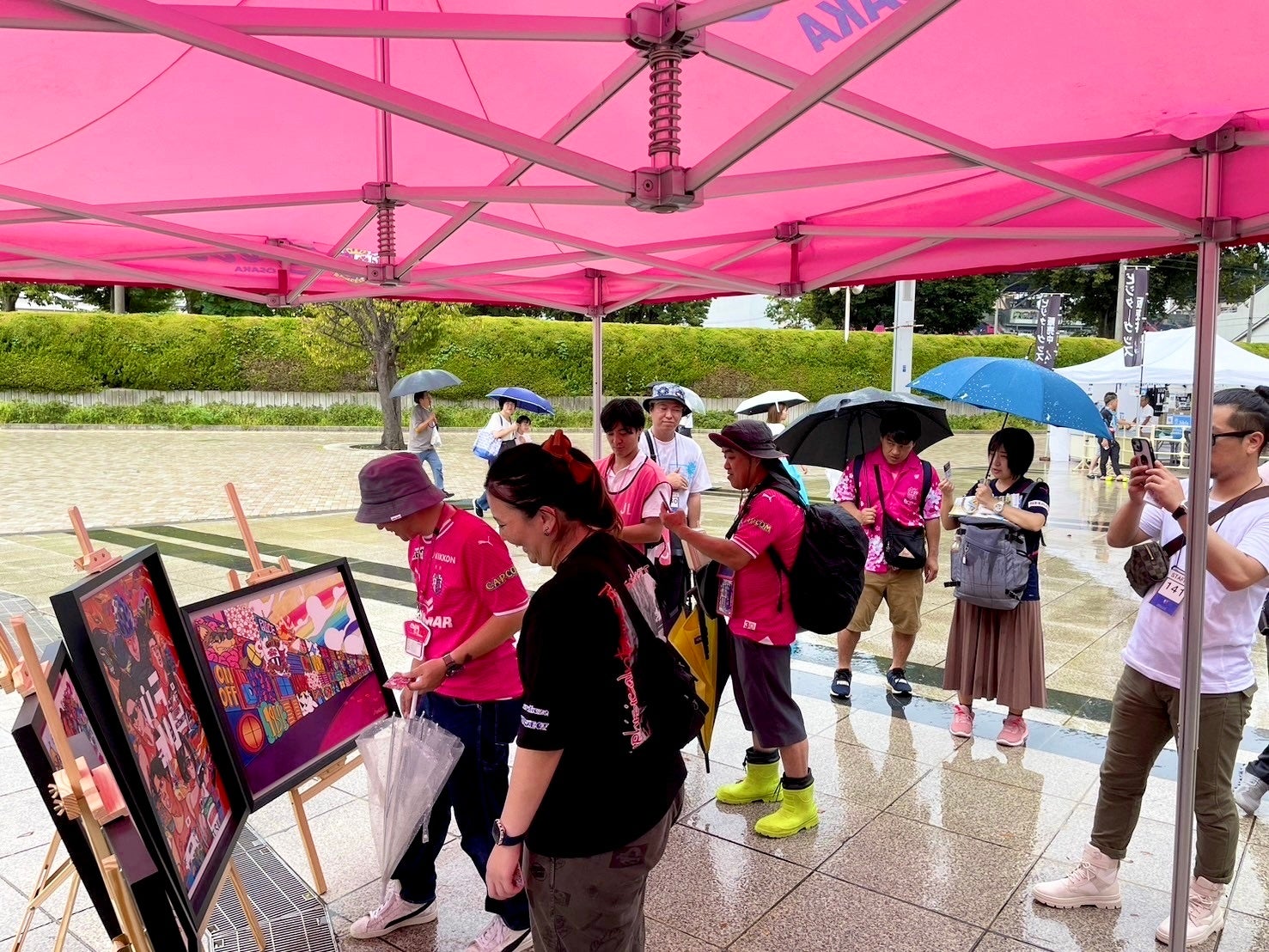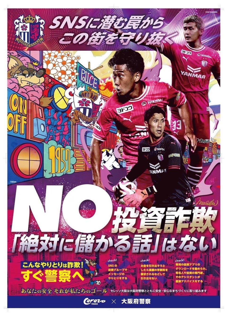 2024年10月19日に開催された磐田戦(ヨドコウ桜スタジアム)では、スタジアムの会場外で出展された大阪府警ブースで、一緒に防犯啓発活動をさせて頂いた。雨の中ブースにお越しいただいた方々にMUSASHI作品を見ていただいたり、子どもたちにMUSASHIの下絵にぬり絵してもらうコーナーも好評だった。
