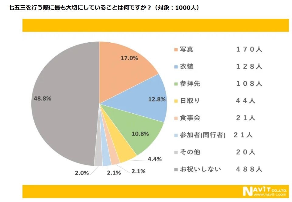 近年の様々なアンケート結果でも、七五三祝いの中でも「参拝」「衣装」「写真撮影」は重要な位置づけで捉えられていることが分かります。
