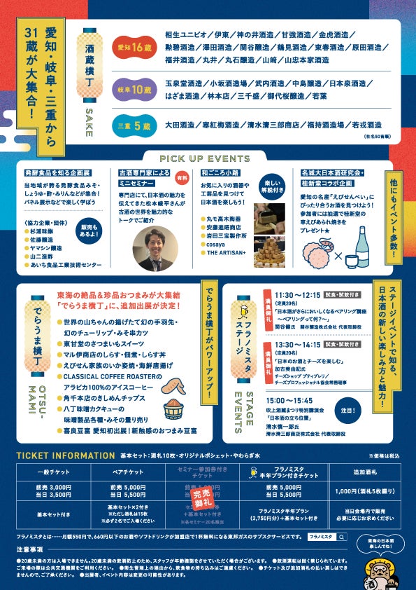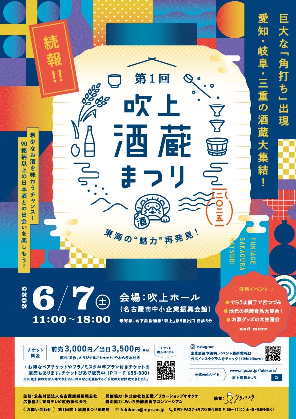 6月7日(土)に吹上ホール(名古屋市)で開催する「第1回吹上酒蔵まつり」に出品される日本酒やおつまみ類が決まりました。ここでしか飲めない銘柄や日本酒とのペアリングが楽しめる各種のおつまみ類をそろえました。皆様のご来場をお待ちしています。