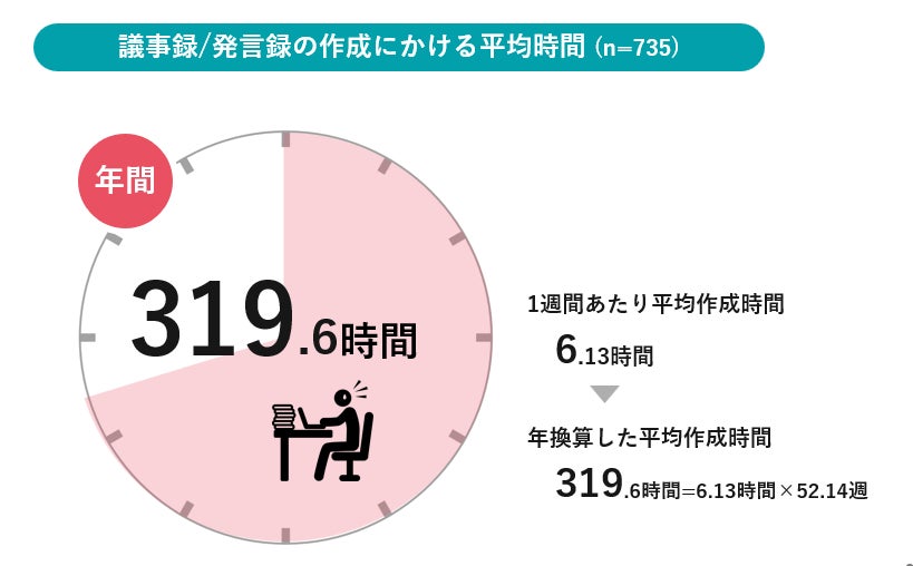 企業全体でDXが推進されていく一方で、議事録作成は依然として工数が多い非効率的な業務の一つです。キヤノンマーケティングジャパン株式会社が2023年に実施した調査によると、日本のビジネスパーソンは平均で年間約320時間もの時間を議事録作成に費やしているという結果が出ており、これは企業全体の生産性における喫緊の課題となっています。