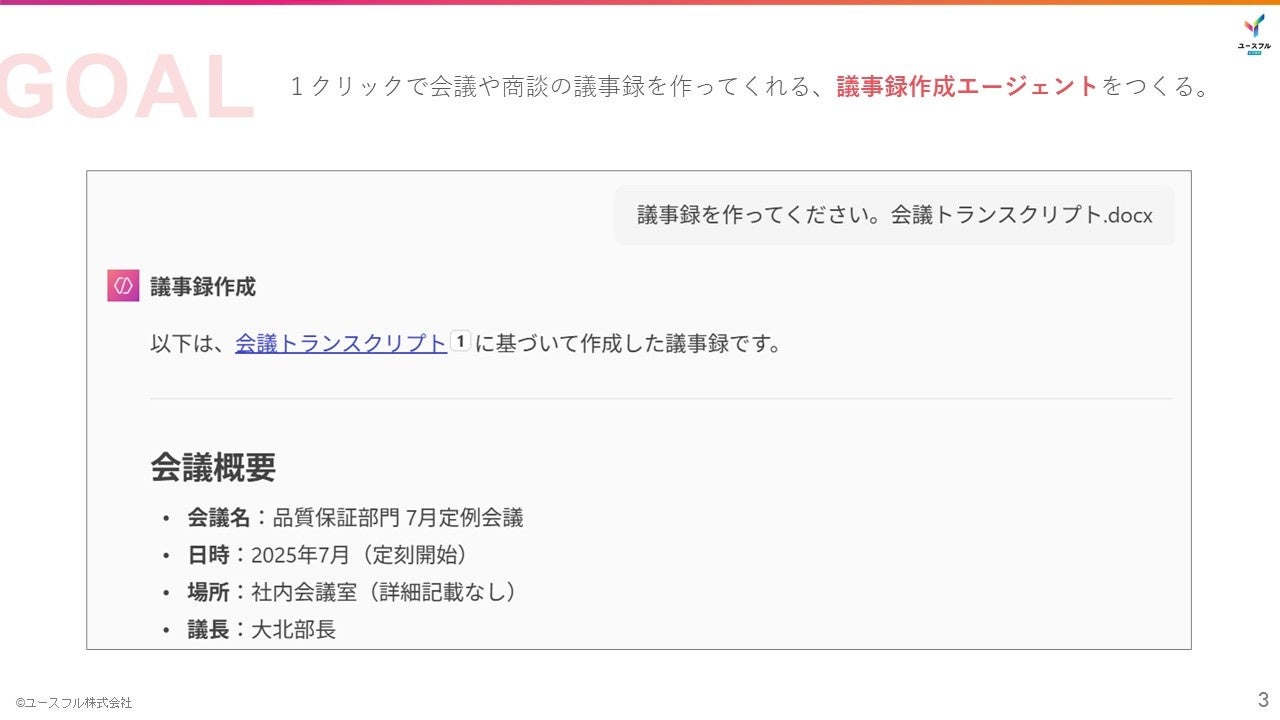 ■内容:Copilot エージェントを活用した議事録作成の自動化支援