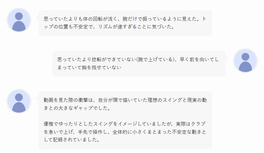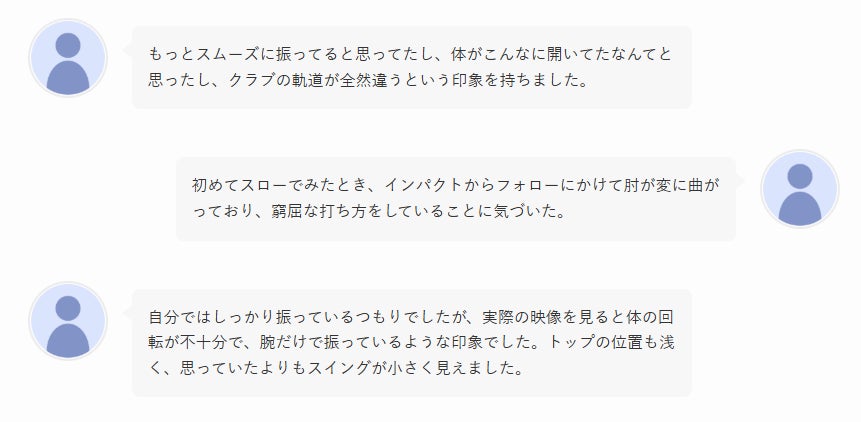 特に「自主練でフォーム改善に取り組んだ」と回答した人の多くは、以下のように映像を通じて初めて気づいた自分の課題を、実際の練習で修正しようとしていることがうかがえます。