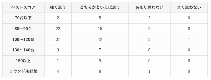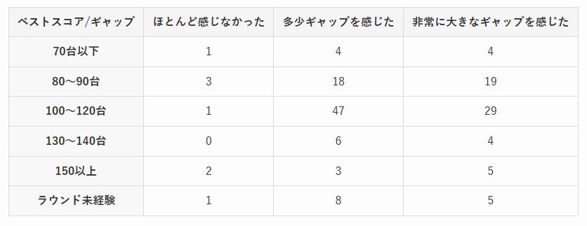 特にスコア100〜120台の中級層では「ギャップを感じた」と回答した割合が高く、フォームを意識的に整え始める層ほど、理想とのズレを明確に自覚しやすい傾向にあるといえるでしょう。