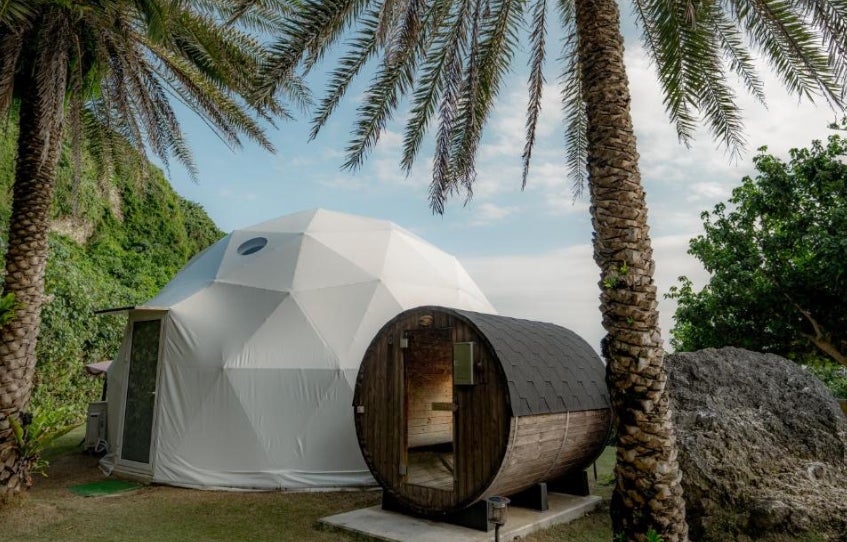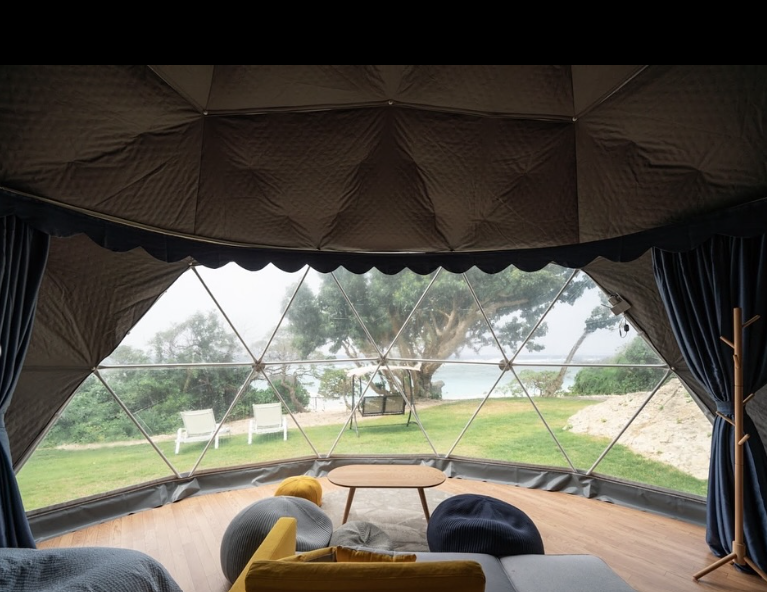 沖縄の美しい自然の中に佇むThe PANALI のドームテントでは、大自然に溶け込む特別な滞在ができます。大きな窓からは沖縄の海と豊かな緑が広がり、心地よい風と満天の星に包まれる特別なひとときをお楽しみいただけます。
