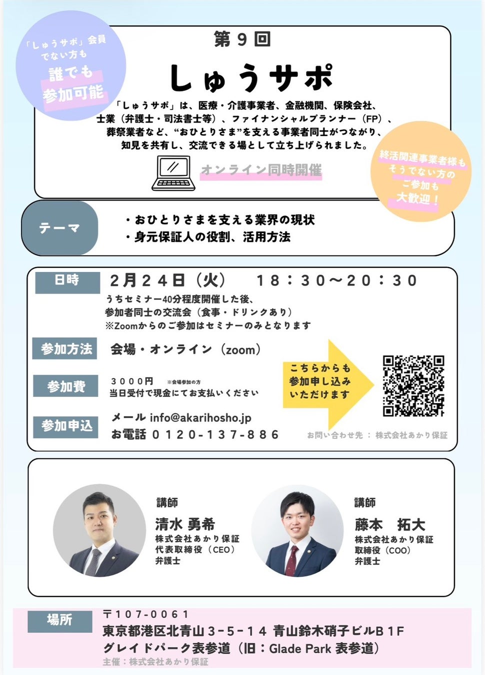 弁護士・司法書士・ケアマネジャーなどの専門家が連携し、身元保証サービスを提供する株式会社あかり保証(代表取締役・弁護士:清水 勇希、本社:大阪府大阪市)は、おひとりさまを支える事業者コミュニティ「しゅうサポ」の第9回を2月24日(火)に東京にて開催いたします。
