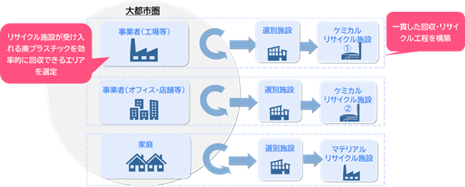 本実証事業は、再生プラスチックをはじめとする再生材の供給量を一層拡大するべく、再生材の回収から再資源化までのスキームを、大都市圏、地方都市、中小地域といった地域特性に応じて構築し、各地域の関係事業者とともに実証を行うことで、資源循環システムの構築を目指すものです。