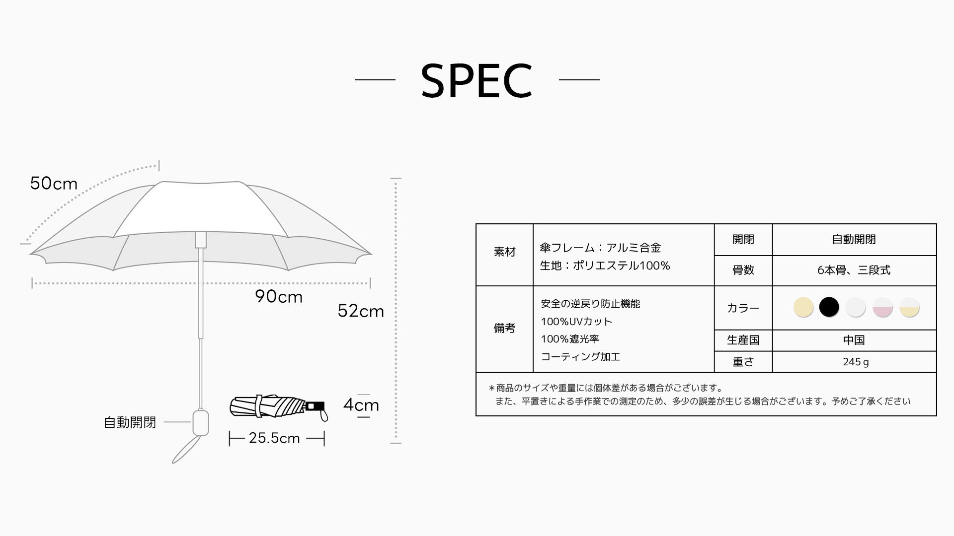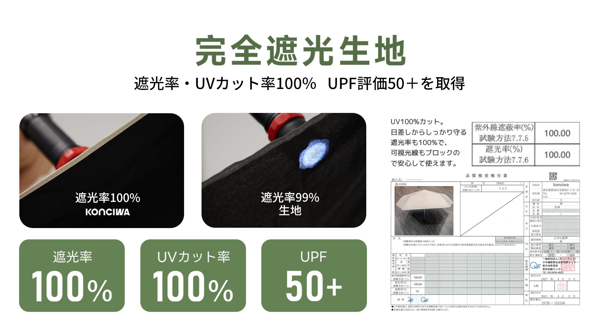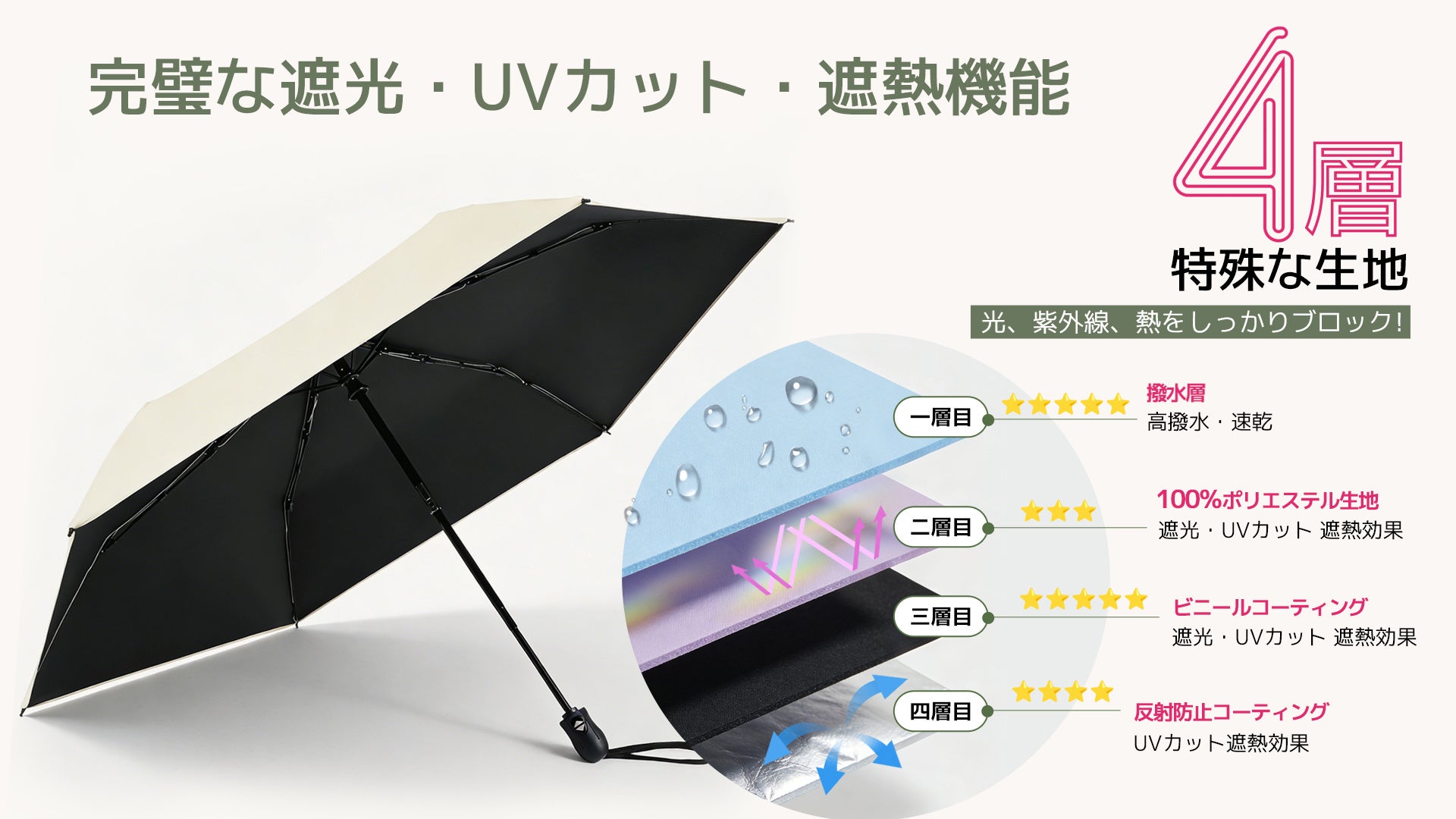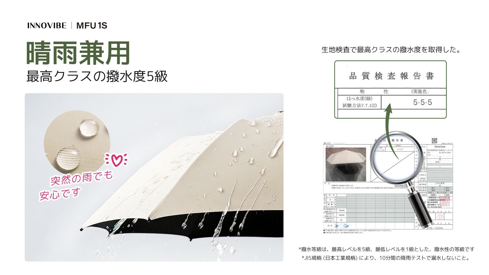 全天候対応: 撥水度試験で最高ランクの5級を取得。雨粒を瞬時に弾くため、晴雨兼用として一年中活躍します。