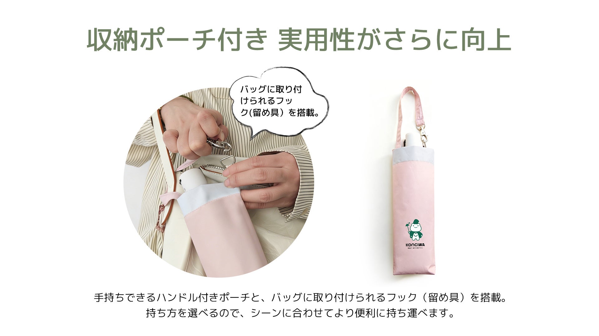 フック(留め具)搭載: バッグ外側に装着でき、濡れによるストレスを軽減します。