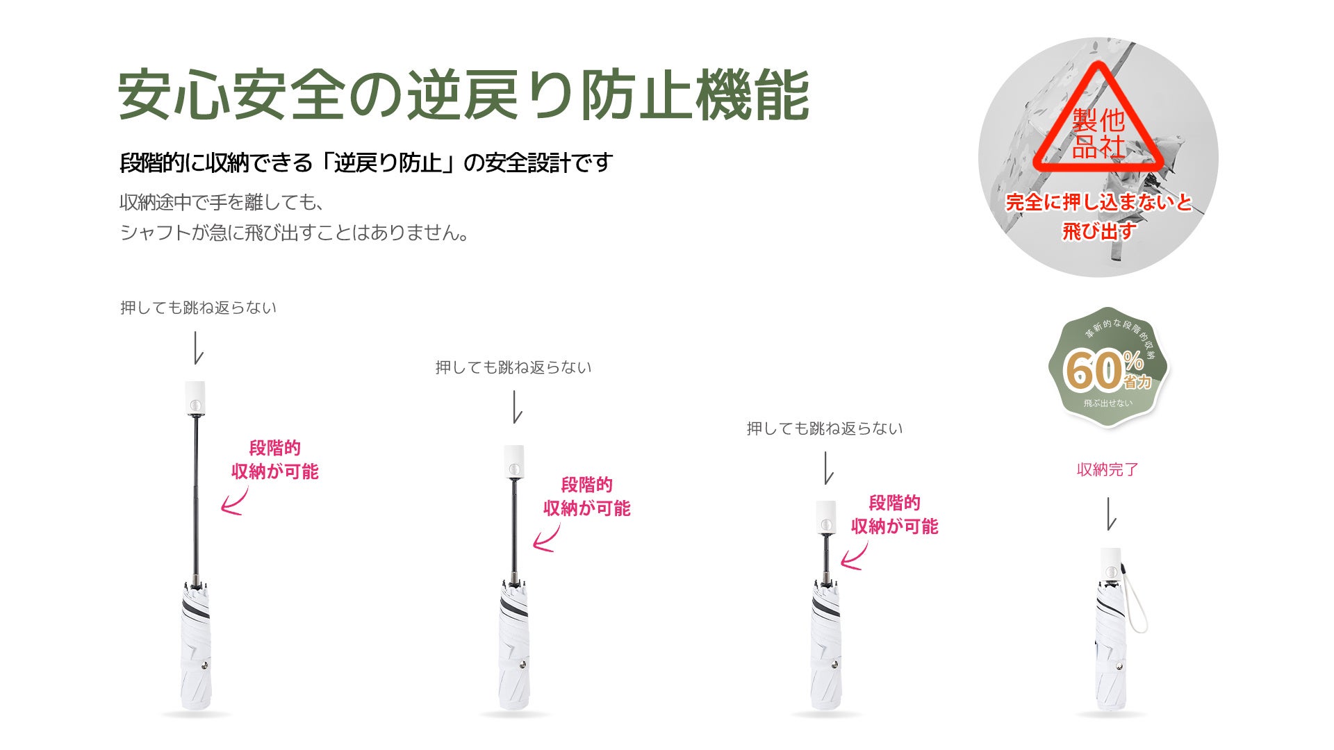 逆戻り防止: ワンタッチ自動開閉に加え、収納時にシャフトが急に飛び出さない安全設計を採用。