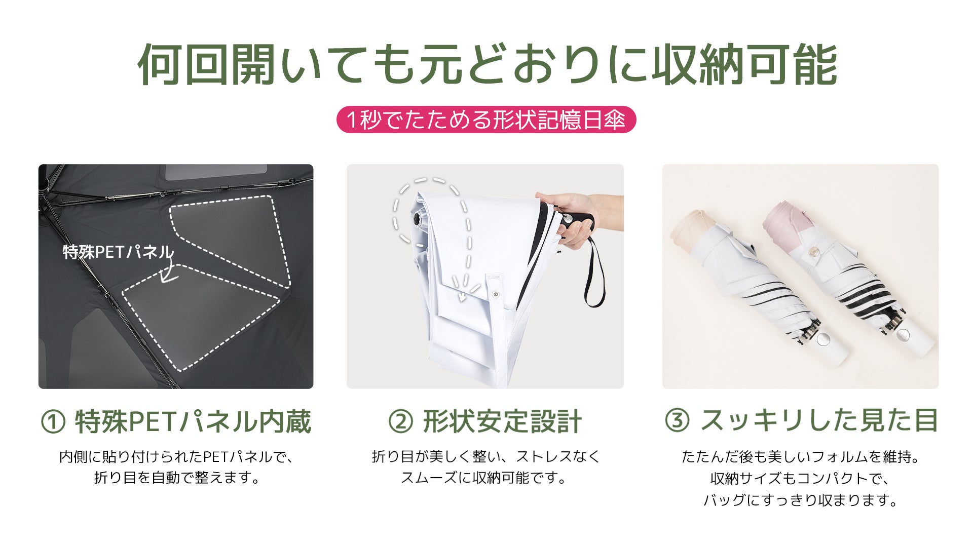 内側に内蔵された特殊PETパネルが、傘の開閉動作と連動し、生地を理想的な折り目へと導きます。