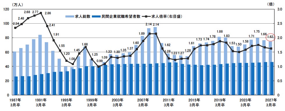 2027年3月卒業予定の大学生・大学院生対象の大卒求人倍率は1.62倍と、2026年卒の1.66倍より0.04ポイント低下した。