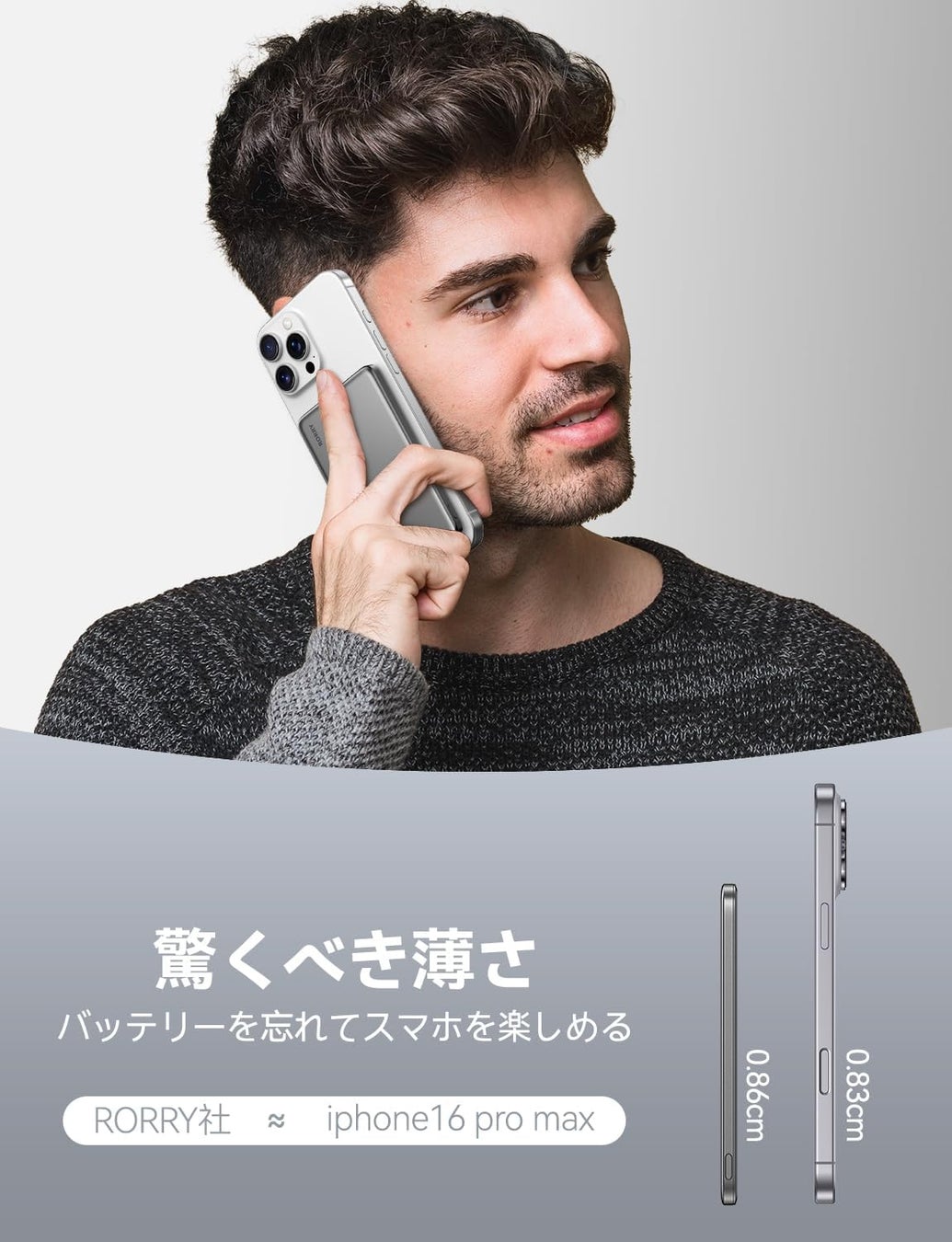 世界最薄クラスのMagSafe対応モバイルバッテリー「D14」は、厚さわずか8.6mm、重さ約110gというスリムかつ軽量なボディで、日常持ち歩きに最適です。ポケットに入れてもかさばらず、スマホと重ね持ちしても違和感のないコンパクト設計。